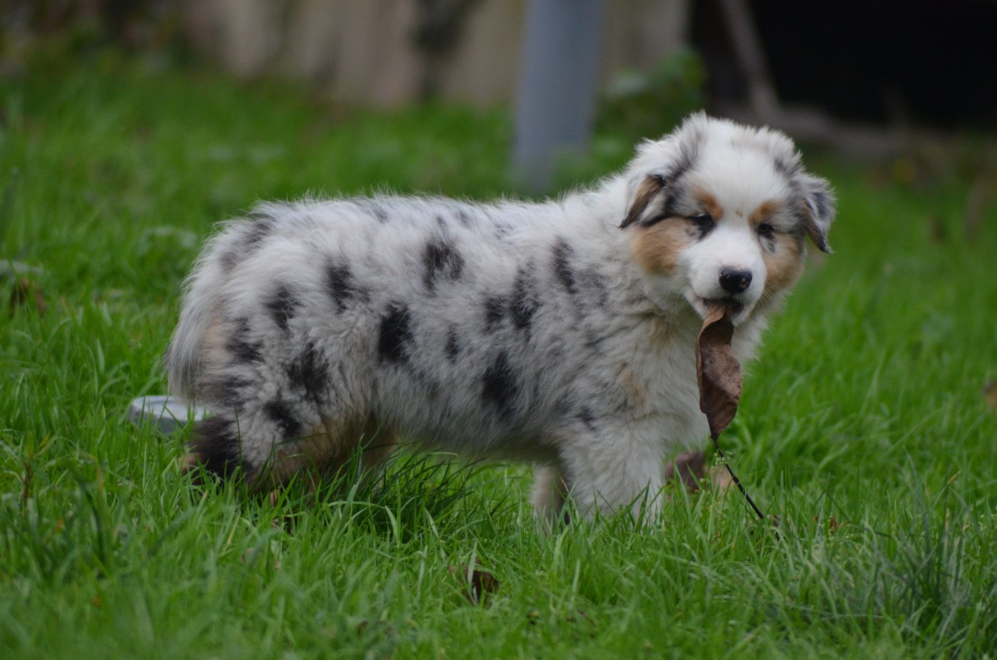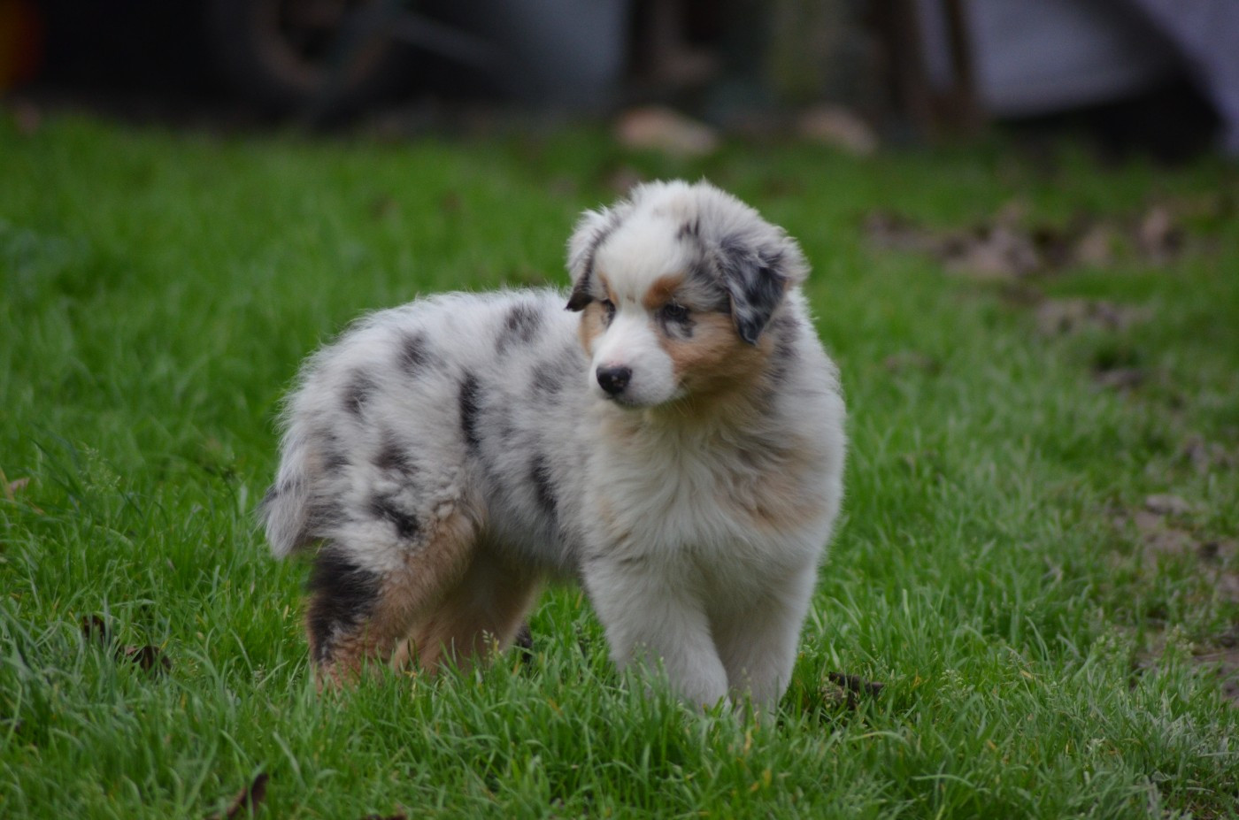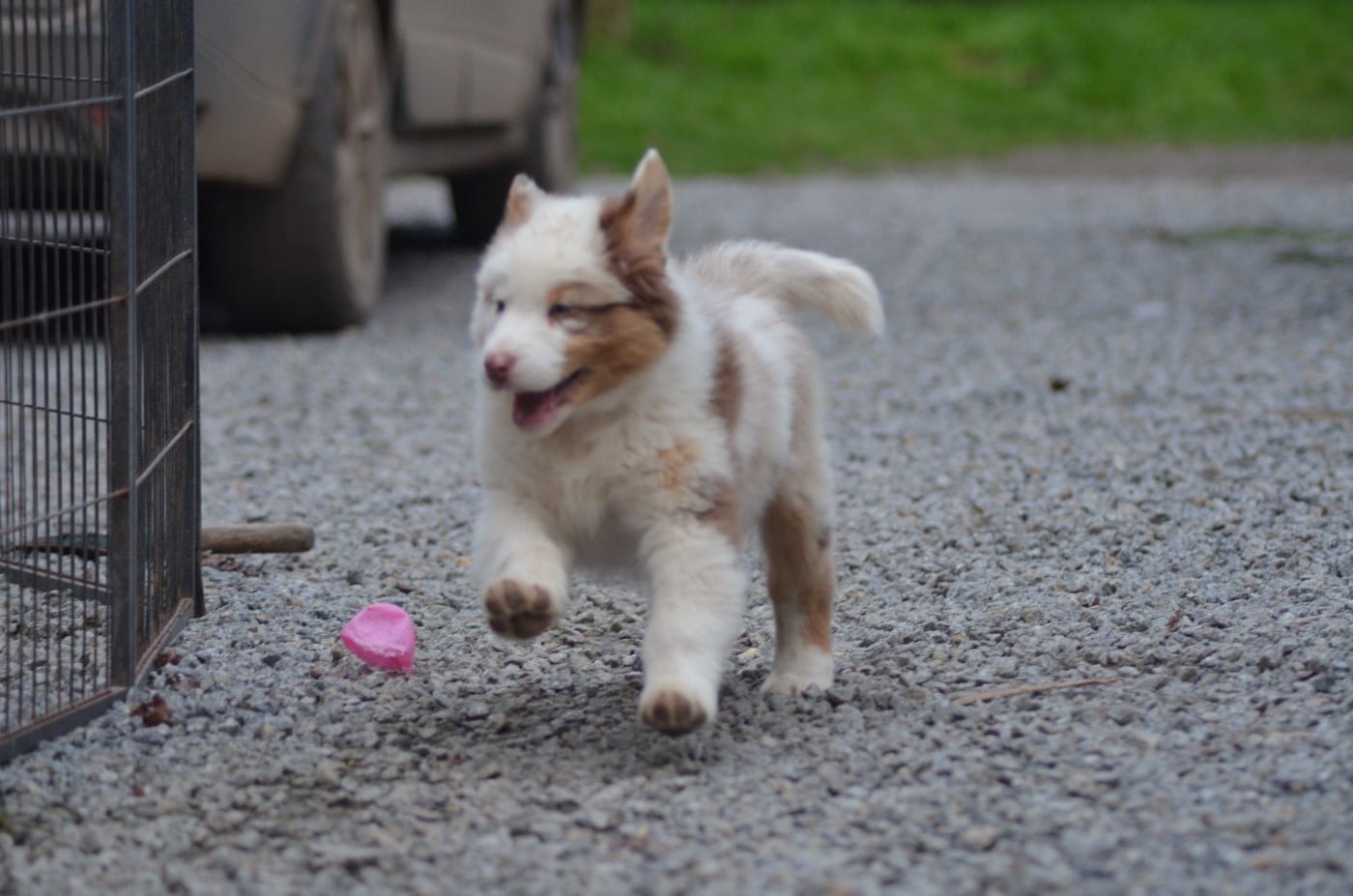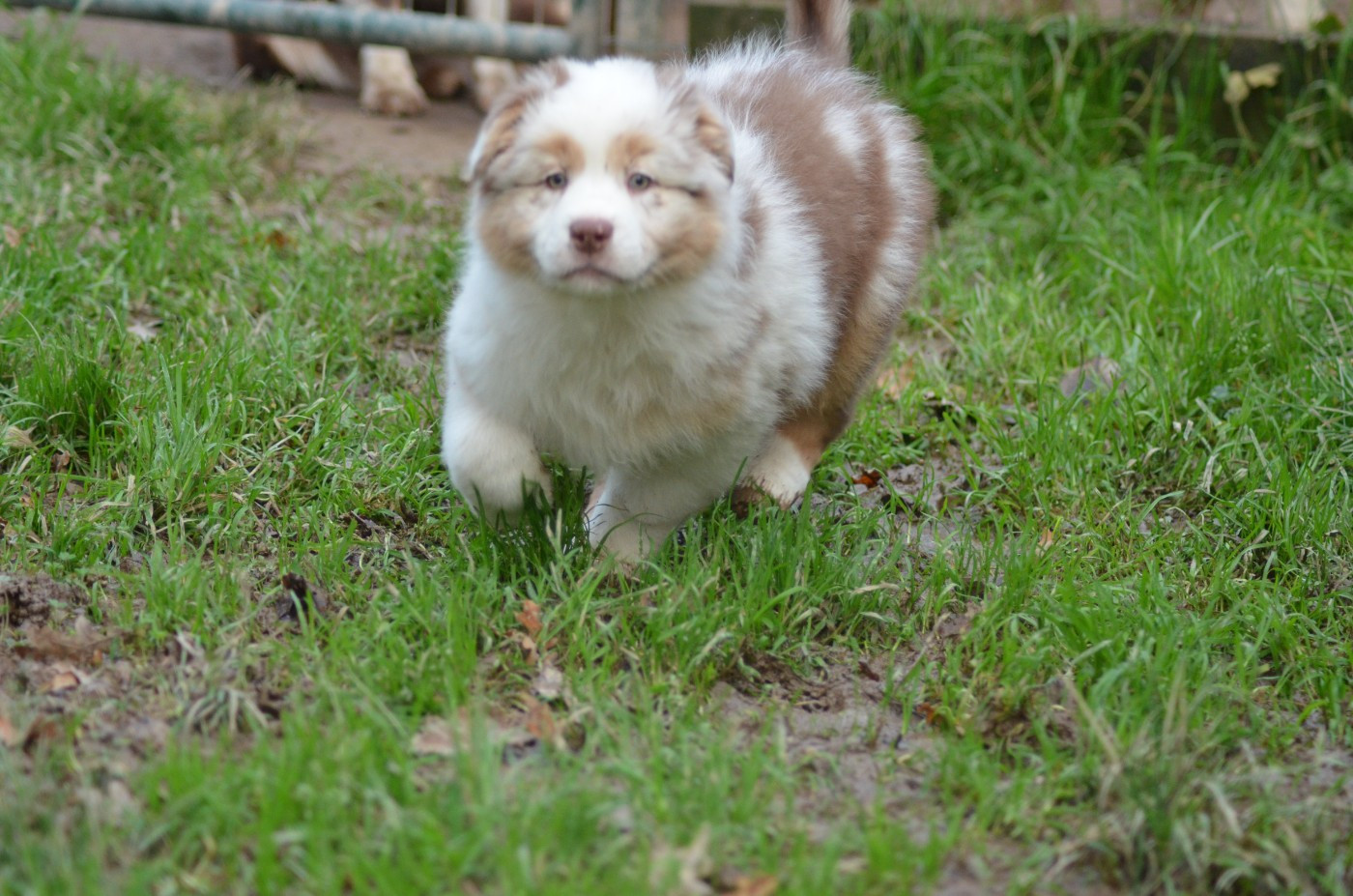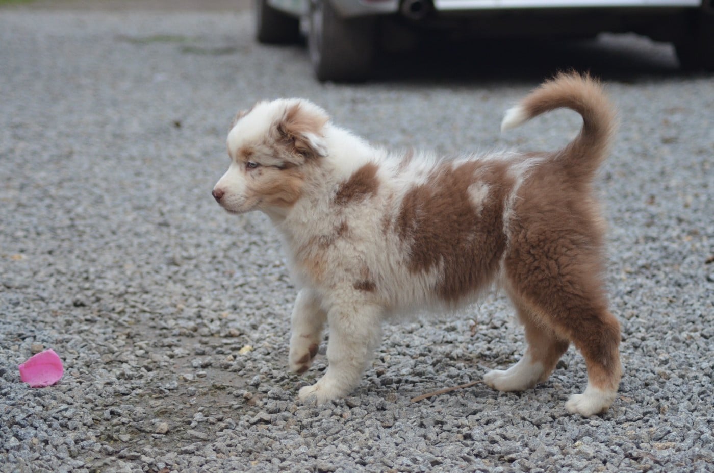 Mâle rouge merle queue mi longue. Pour compagnie uniquement car non confirmable au standard, manque de la couleur sur le visage.